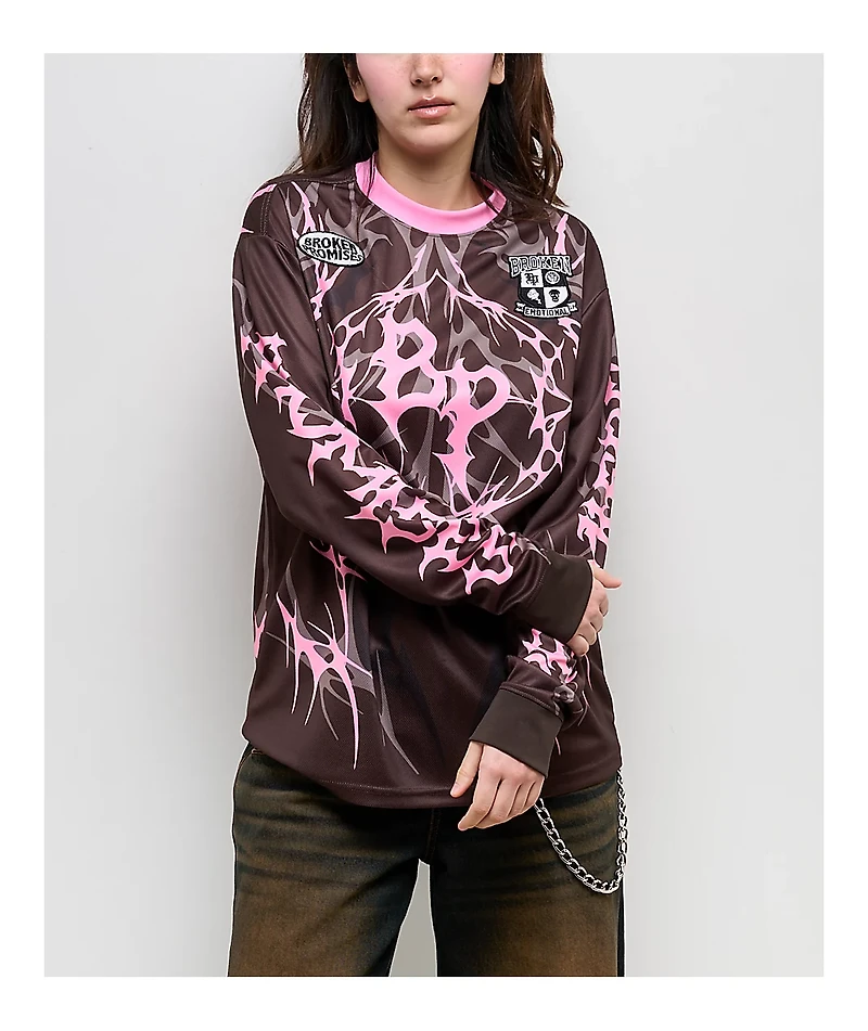 Influenced by motocross racing uniforms, Broken Promises welcomes the Ritual Moto long sleeve jersey in a brown polyester mesh construction with pink cybersigilism graphics sublimated throughout for an edgy, dangerous vibe. Hosting embroidered brand
