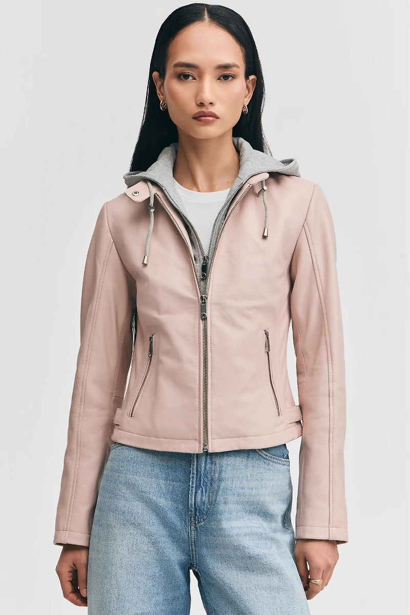 A modern slim fit layered-look jacket featuring a sleek zip-front closure and adjustable drawstrings. Designed with detachable cotton hooded insert that creates a contemporary, two-in-one effect. Perfect for transitional weather, it pairs effortlessly with denim for an elevated casual look.