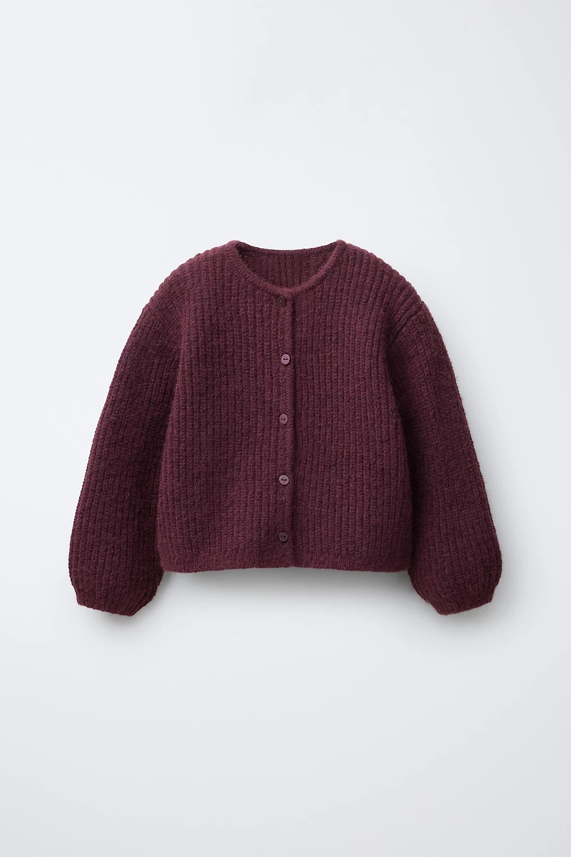 Knit cardigan with round neck and long sleeves. Front button closure.