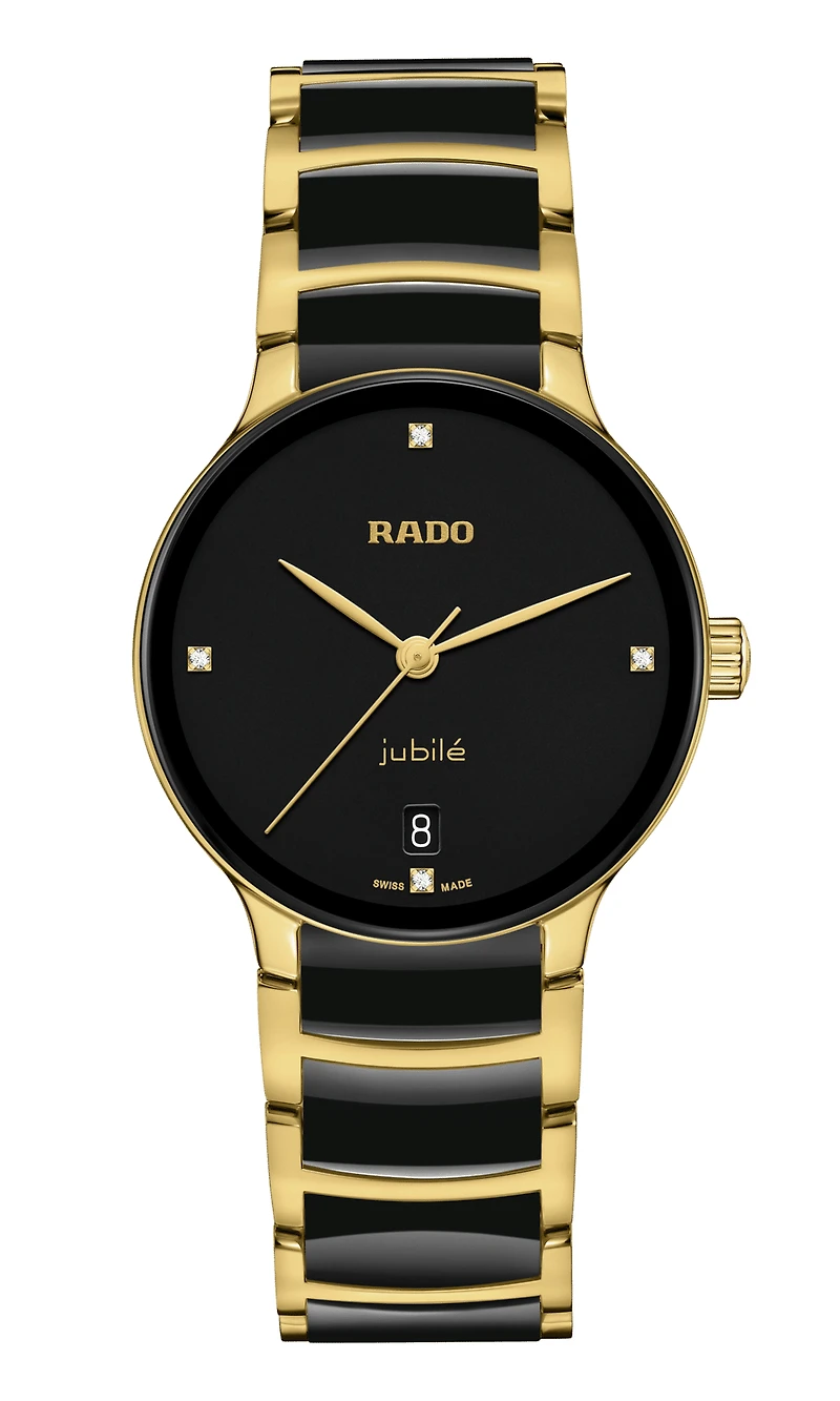 The classic Centrix Quartz Diamonds watch has been reworked not only technically, but also aesthetically. The modified model has a rounded sapphire crystal that extends all the way to the edge and a curved case blending with the curved crystal edge. The overall appearance of this iconic timepiece is completed with adjusted case lugs and a bracelet made of polished yellow gold-coloured PVD-coated stainless steel with black high-tech ceramic middle links. The black lacquered dial with 4 diamonds, emphasised with the printed 'jubilé' logo, matches perfectly with the yellow gold-coloured hands. Thanks to the PreciDrive and HeavyDrive features in the calibre R073 quartz movement, the watch has greater accuracy and resistance to shocks. The watch is water-resistant down to 50 m.