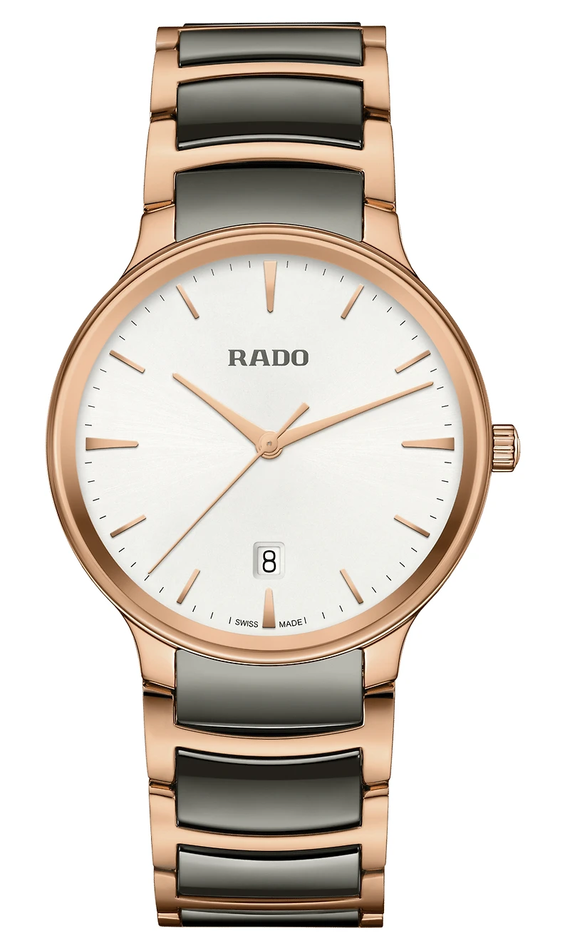 The classic Centrix Quartz has been reworked not only technically, but also aesthetically. The modified model has a rounded sapphire crystal that extends all the way to the edge and a curved case blending with the curved crystal edge. The overall appearance of this iconic timepiece is completed with adjusted case lugs and a bracelet made of polished rose gold-coloured PVD-coated stainless steel with plasma high-tech ceramic middle links. The silver sunray dial with rose gold-coloured applied indexes matches perfectly with the rose gold-coloured hands. Thanks to the PreciDrive and HeavyDrive features in the calibre R073 quartz movement, the watch has greater accuracy and resistance to shocks. The watch is water-resistant down to 50 m.