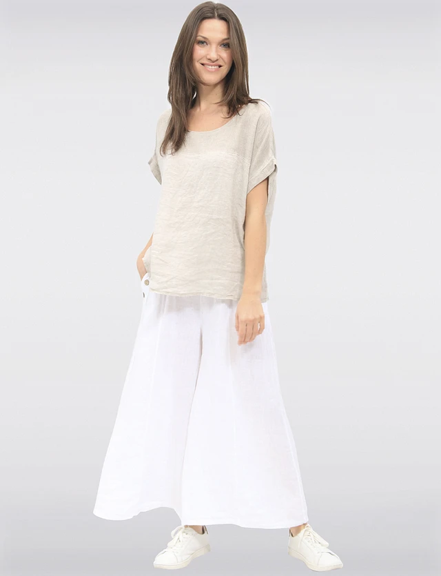 Chic Drop-Shoulder Cap Sleeve Linen Top with Folded Cuff Detail by Froccella