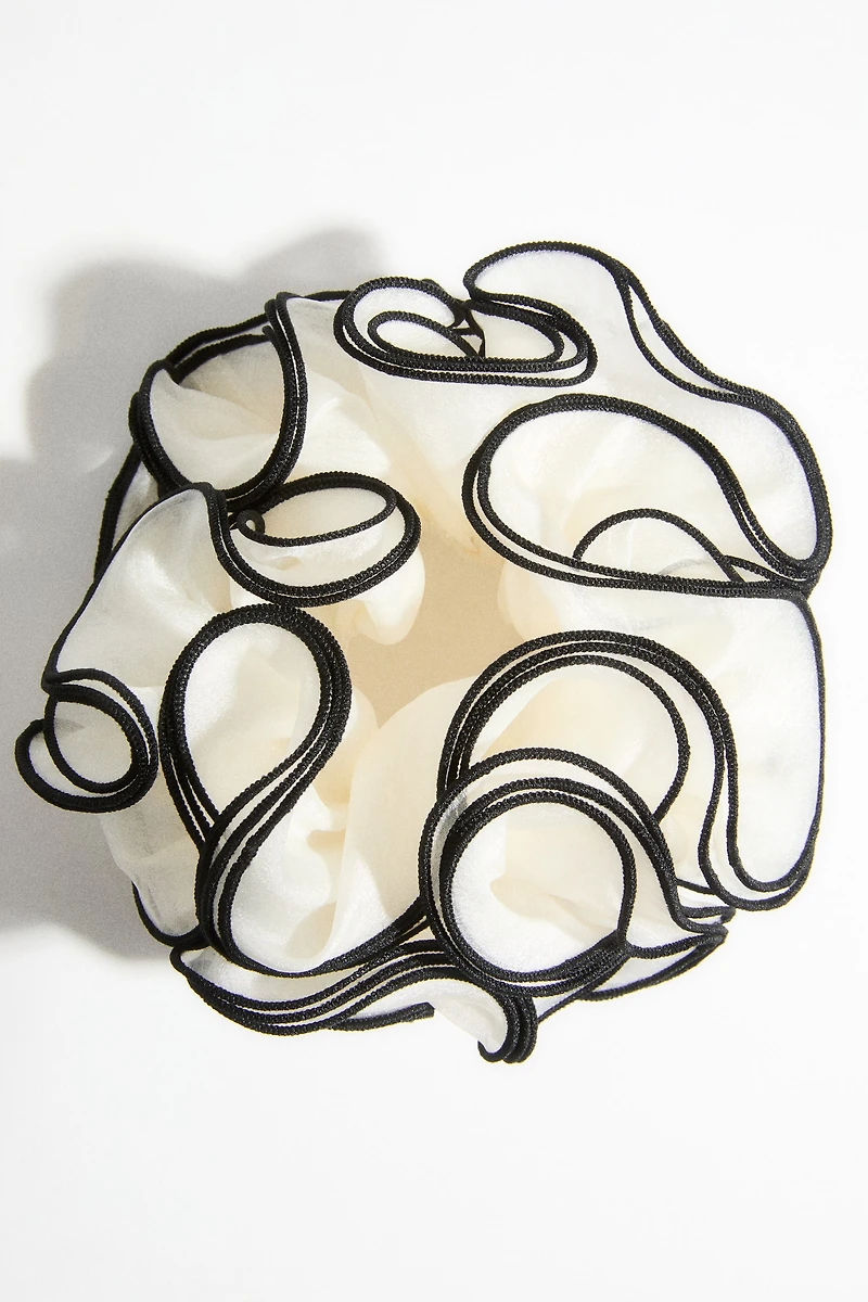 Scrunchie with multiple layers of sheer chiffon and accent-color overlocked trim.