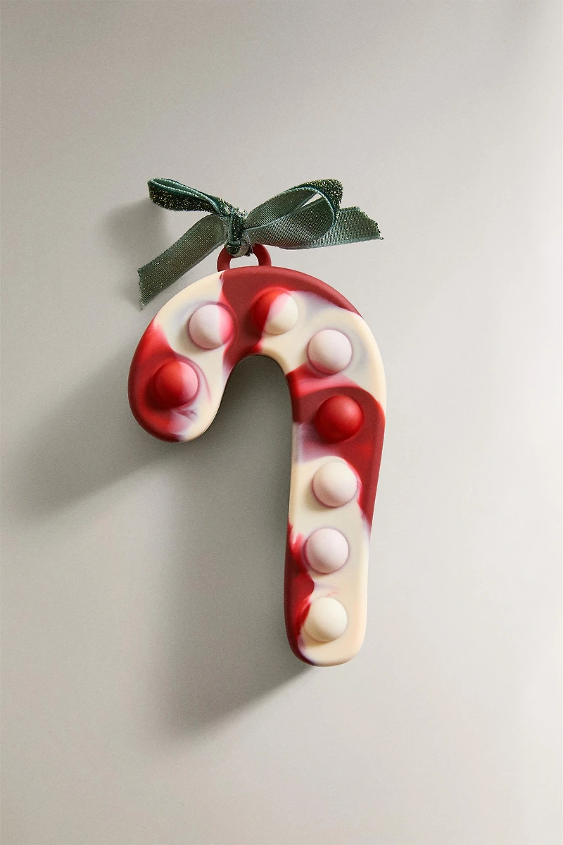Children's silicone Pop It toy in the shape of a Christmas candy cane. Its surface is covered with silicone bubbles for pressing and playing.