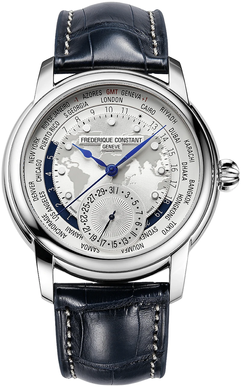 Conceived and produced in-house, the Classic Worldtimer Manufacture with date and worldtime functionality adjustable by the crown features a polished stainless steel case with silver world map dial with luminous markers on a navy alligator strap