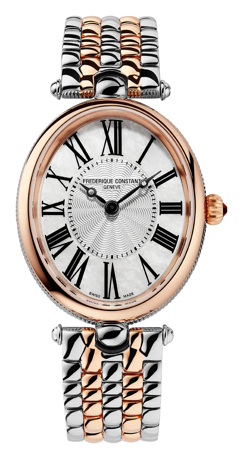 A wearable masterpiece, the Classics Art Déco Oval evokes the opulent style that swept through fashionable European circles in the 1920s. This vintage-inspired timepiece features a Mother-of-Pearl and "Guilloché" decorated dial and black printed Roman numerals. This timepiece has a rose gold plated and stainless steel gleaming bracelet.