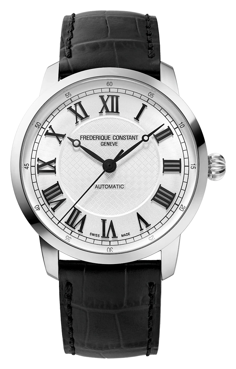 This Classic Automatic is a modern and dynamic timepiece, fit for everyday use. Featuring a white dial, black printed white Roman numeral markers, and stainless steel case. Powered by the automatic FC-301 calibre, and complemented by a black leather strap with crocodile embossing