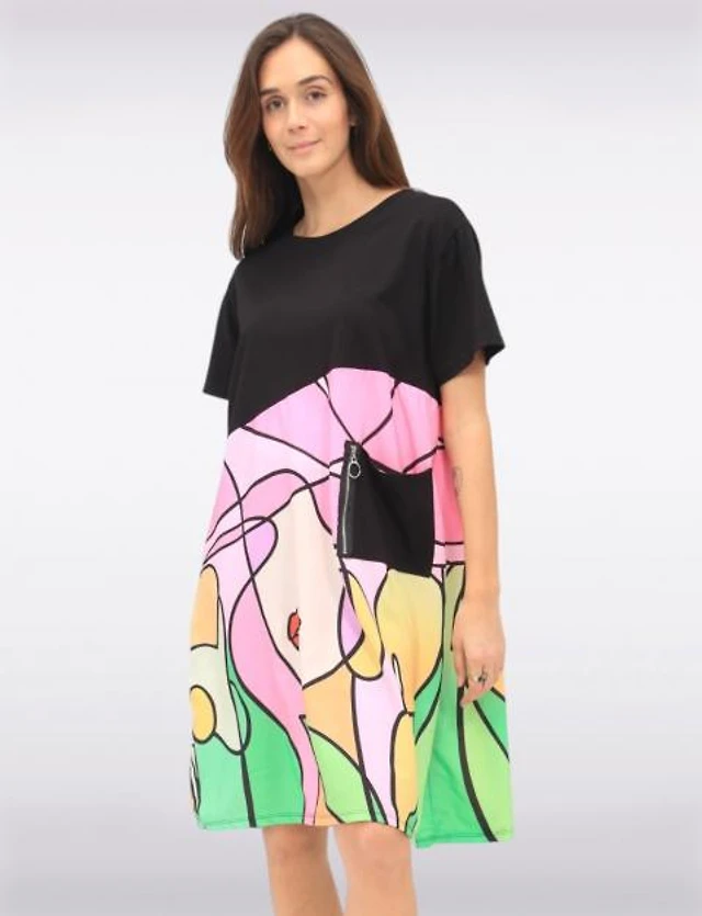 Colourful Cotton Abstract Face Print Black Round Neck T-Shirt Dress by Froccella