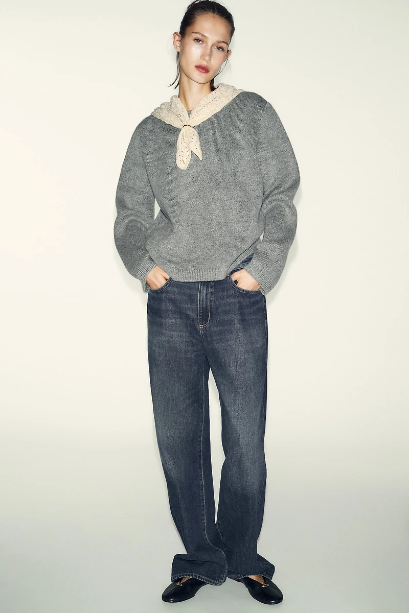 Round neck long sleeve jumper. Scarf with combination fabric and tied with a golden ring. Ribbed trim.