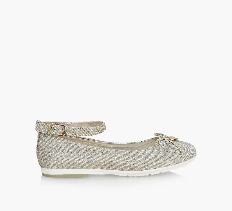 Cookies N Cream is a dainty flat for growing feet. The classic ballerina silhouette is enhanced by a practical ankle strap for all-day wear and enough flair for the more special occasions. Finished with a glittery upper sealed with a bow on the toe.