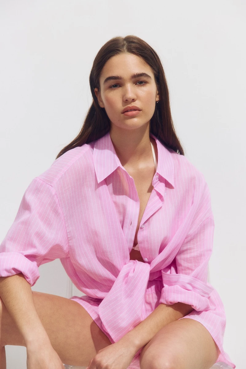 Loose-fit beach shirt in airy, woven cotton. Collar, buttons at front, and a yoke at back with box pleat. Dropped shoulders, long sleeves, sleeve placket with link button, and button at cuffs. Rounded hem.