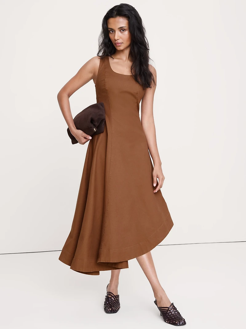 Cut from rugged, yet soft stretch-cotton canvas, we added an asymmetrical hem to emphasize the paneled construction and wrapping seams of this fit-and-flare dress. Fit & Flare: Fitted bust, defined waist with a flare skirt. Scoop neck. Zip at back. Side seam pockets. Unlined.