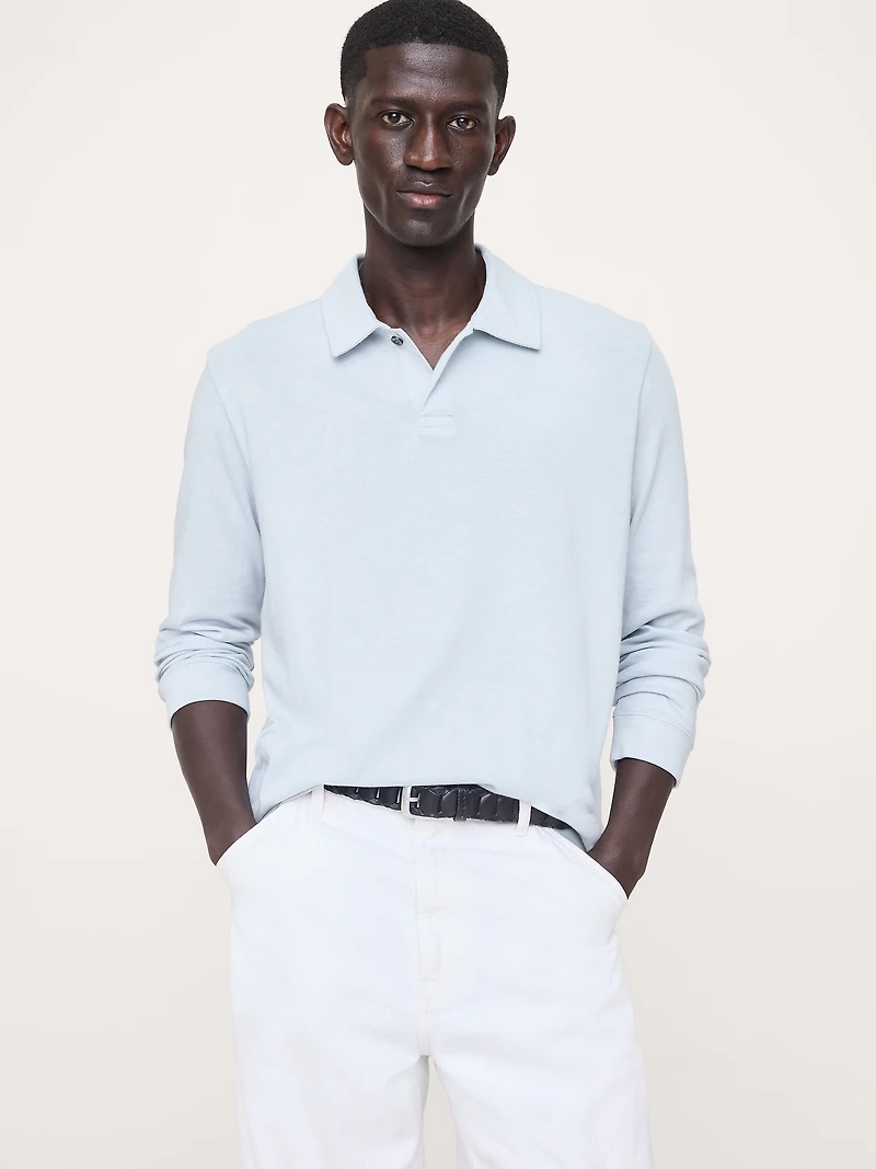 A classic polo crafted for cooler weather with a long sleeve silhouette in a soft cotton jersey we love because it's perfectly at-ease. Relaxed Fit: A straight & roomy fit with a dropped shoulder seam. Johnny collar (one button). Straight hem.
