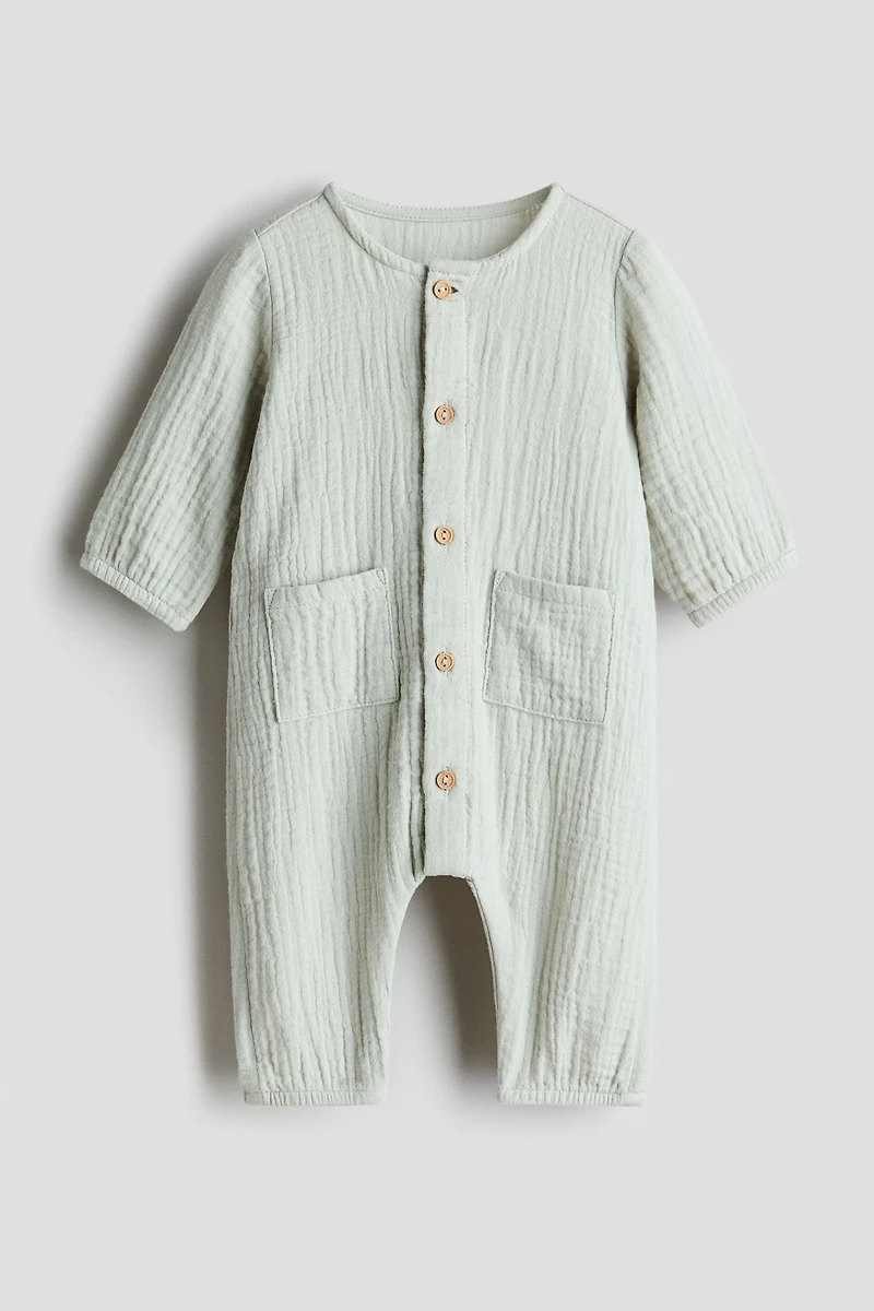 Long-sleeved romper suit in soft cotton muslin. Round neckline, buttons at front, and patch front pockets. Narrow, covered elastic at cuffs and hems.