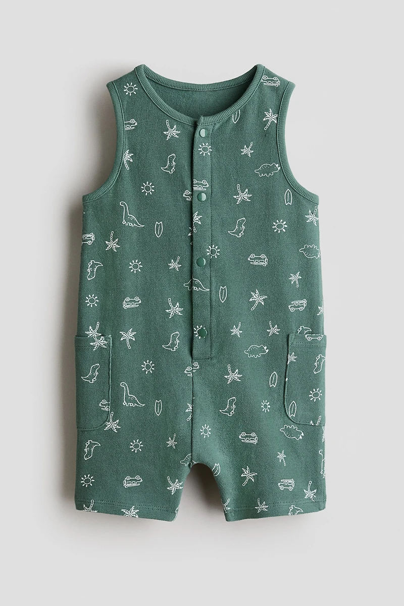 Sleeveless romper suit in soft, lightweight cotton terry. Round neck, snap fasteners at front, and patch side pockets. Short legs.