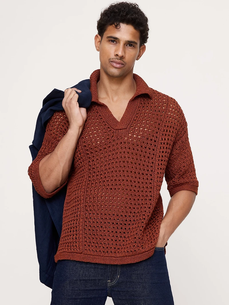 Our take on the season's crochet trend, this sweater polo uses a mix of open, mesh-like stitches to mimic the look and feel of true crochet—in 100% cotton. Relaxed Fit: A straight & roomy fit with a dropped shoulder seam. Johnny collar (no buttons). Straight hem.