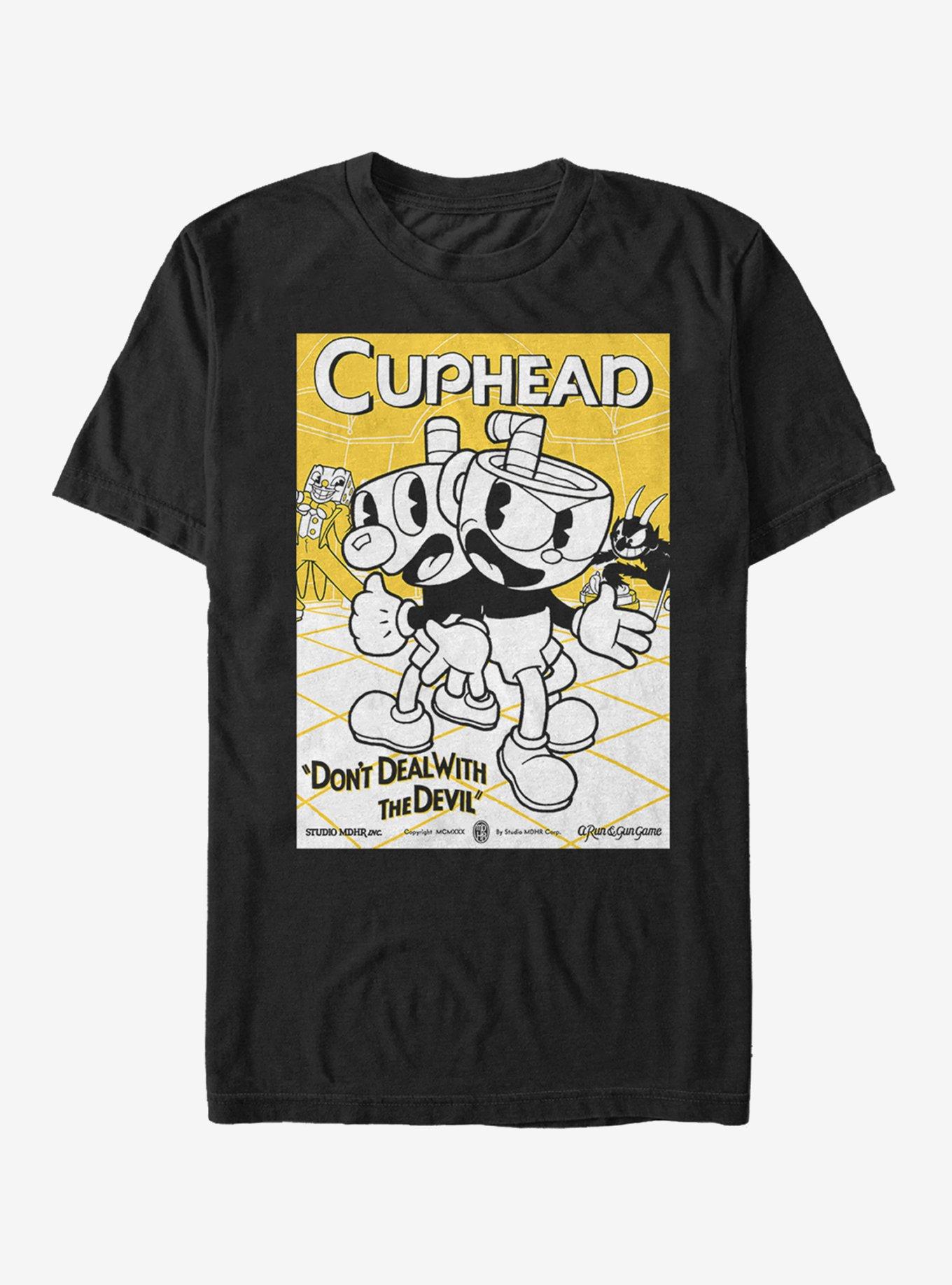 Mr. King Dice never plays nice because he's the Devil's right hand man! Mugman and Cuphead stand back-to-back while the Devil and Mr. King Dice lurk in the background on this poster style Cuphead tee that reads "Cuphead Don't Deal with the Devil" in white and black.