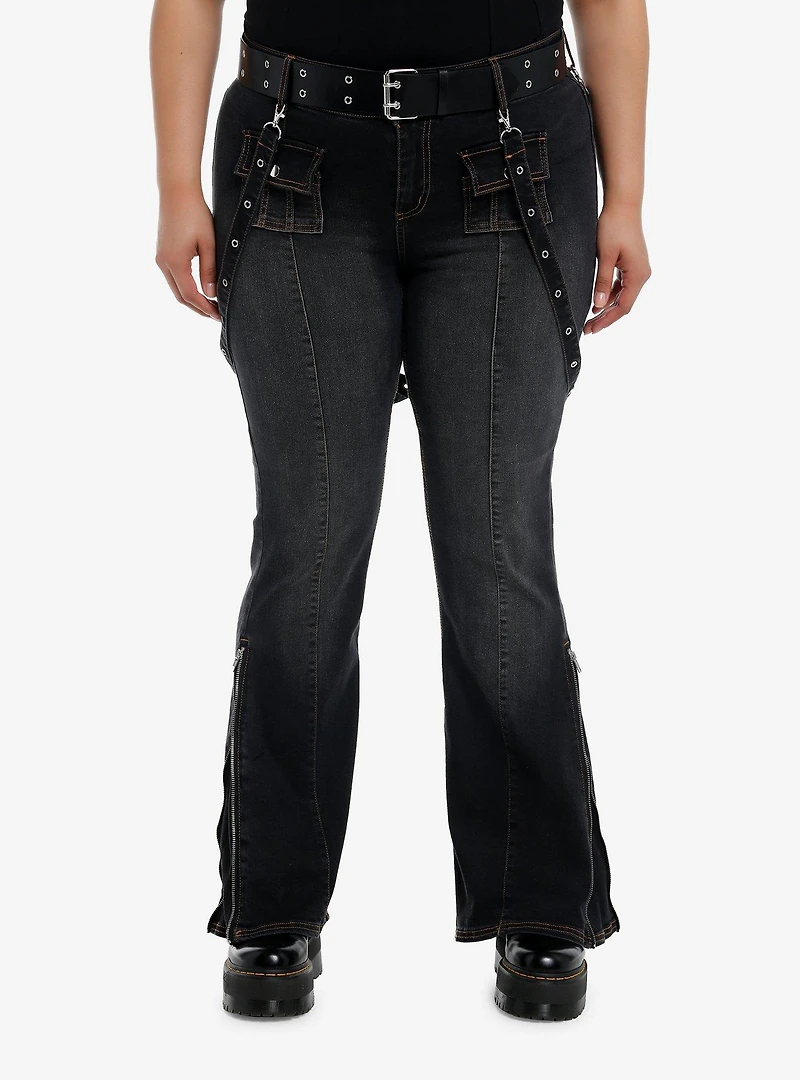 Dark Wash Grommet Suspender Flare Denim Pants With Belt Plus SizeDark Wash Grommet Suspender Flare Denim Pants With Belt Plus SizeDark Wash Grommet Suspender Flare Denim Pants With Belt Plus Size