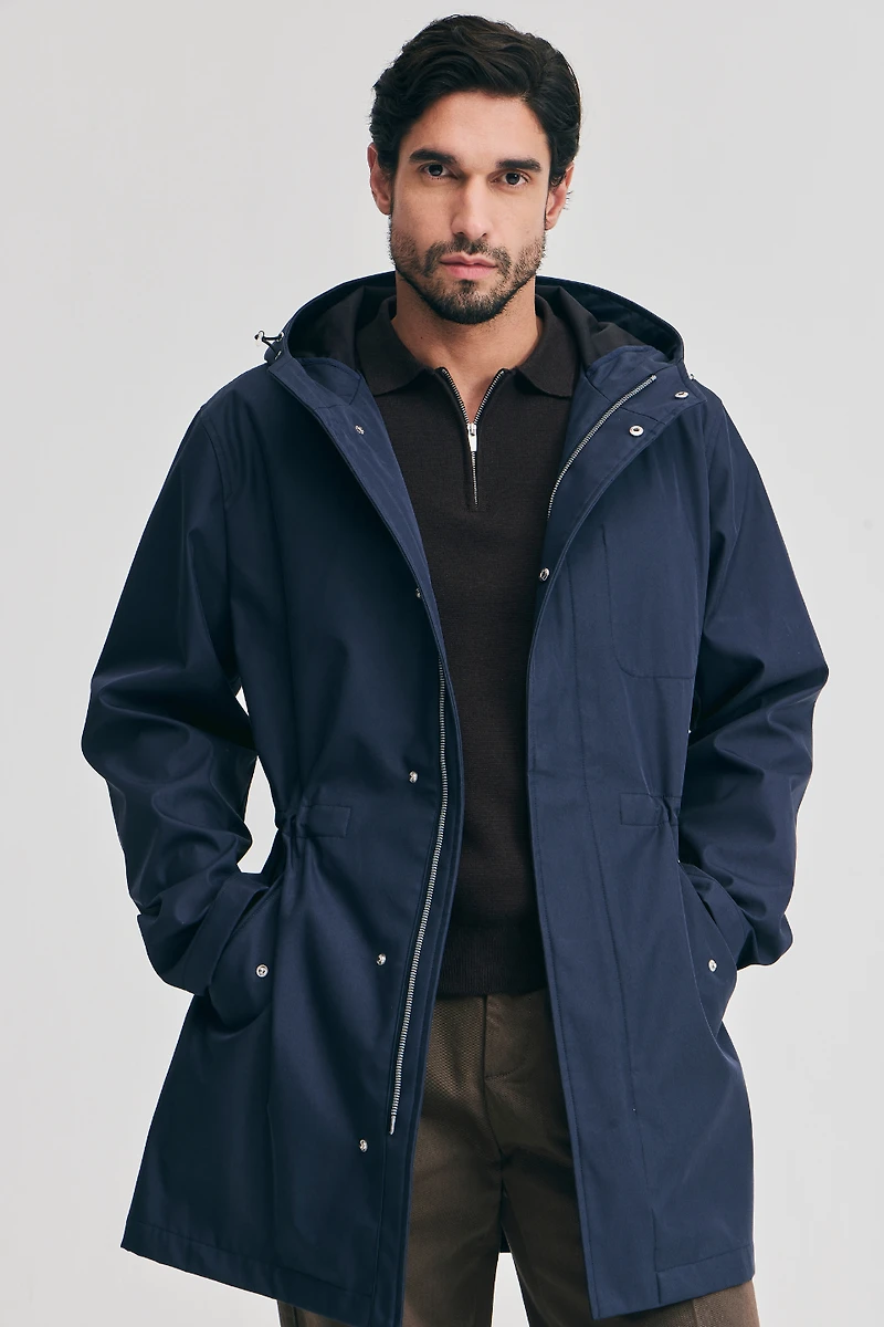 cotton twill fabric with a water-repellent and breathable coating, it offers reliable protection while remaining comfortable throughout the day. The attached hood adds extra coverage for unpredictable weather, making it an ideal outer layer for transitional seasons.