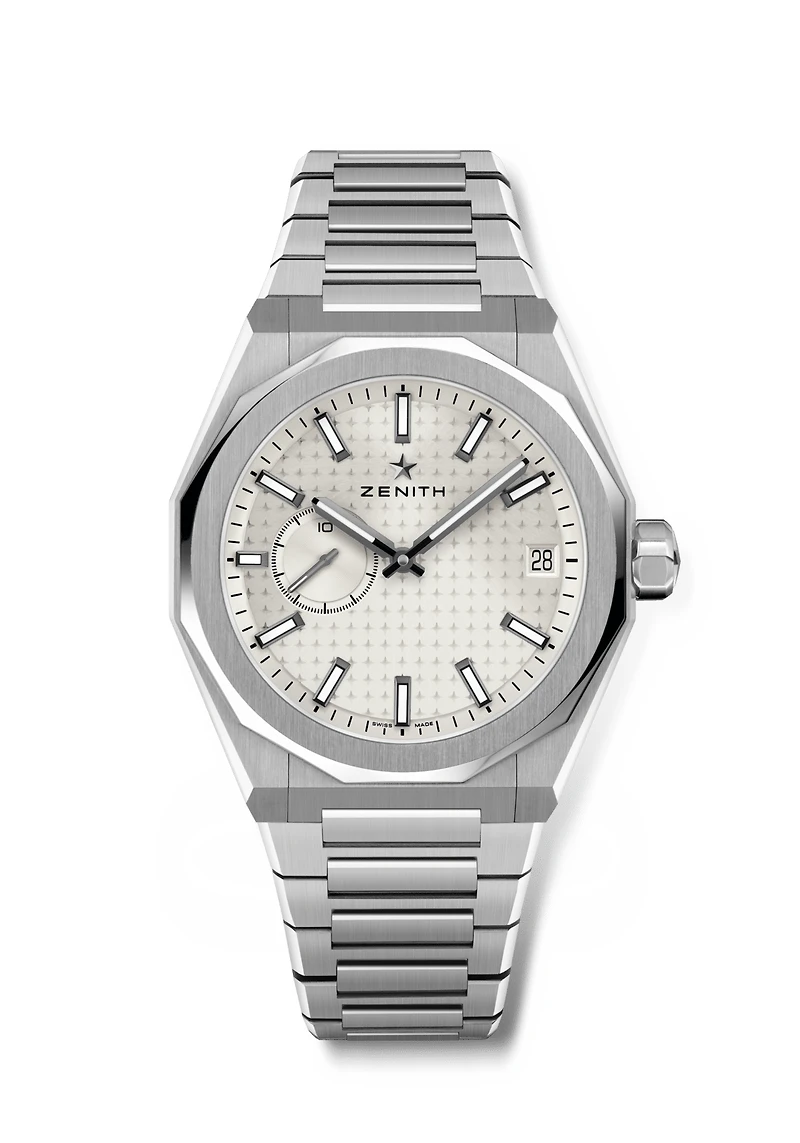 DEFY Skyline in a 41mm steel octagonal case with a faceted bezel, featuring a silver-toned sunburst-patterned dial revisiting the emblematic ZENITH four-pointed star. Powered by the El Primero 3620 high-frequency automatic manufacture movement with the very first 1/10th of a second indicator. Interchangeable steel bracelet and khaki green patterned rubber strap. A second strap is offered to fully experience the interchangeability of the watch.