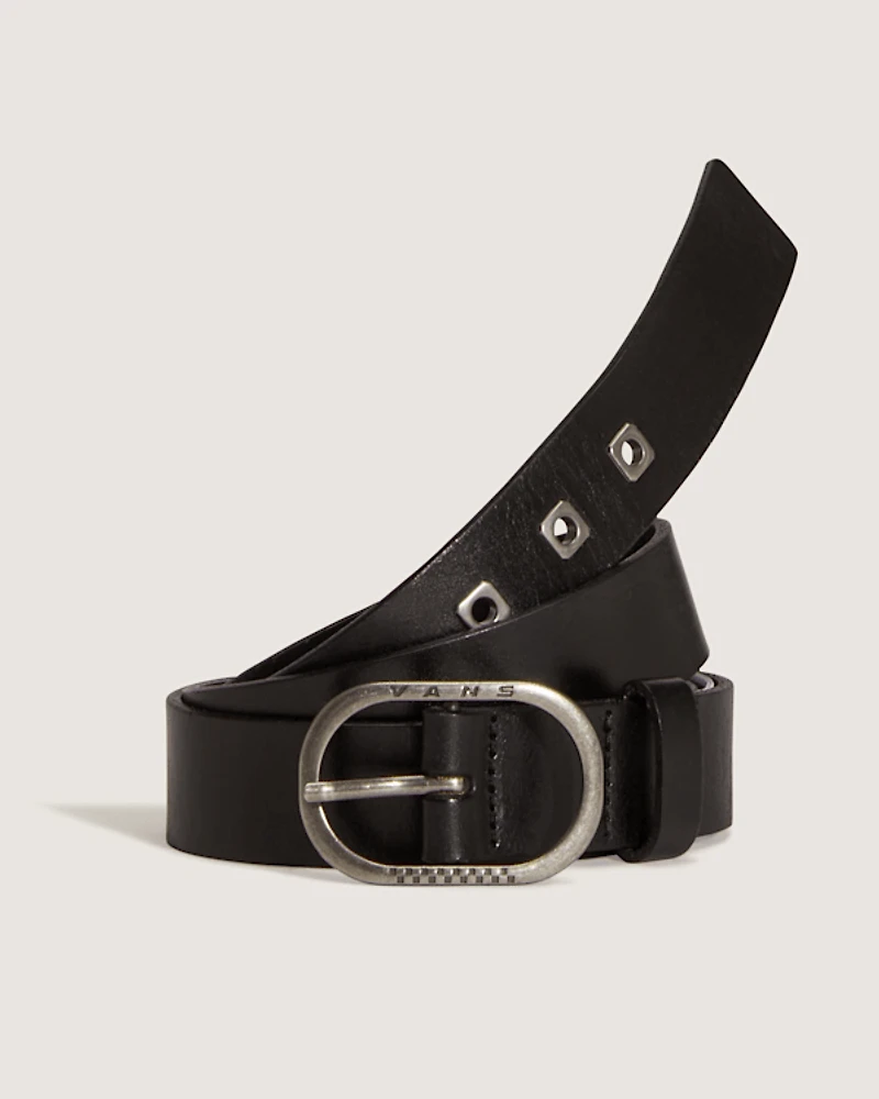 This leather belt brings a touch of attitude to any outfit. Crafted from full-grain leather for lasting durability, it features a sleek oval buckle with the Vans logo and metal stud detailing along the strap. The timeless design pairs easily with jeans or chinos, adding a subtle rebellious accent to your everyday look.