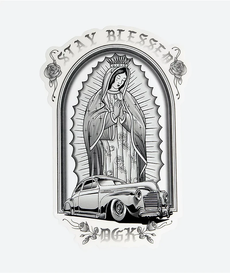Blending SoCal Latinx imagery with street culture inspiration, DGK welcomes the Lo-Side sticker in an 8" tall design measuring 6" wide with black and white graphics to personalize any hard surface. Picturing the Virgin Mary in prayer above an old-sch