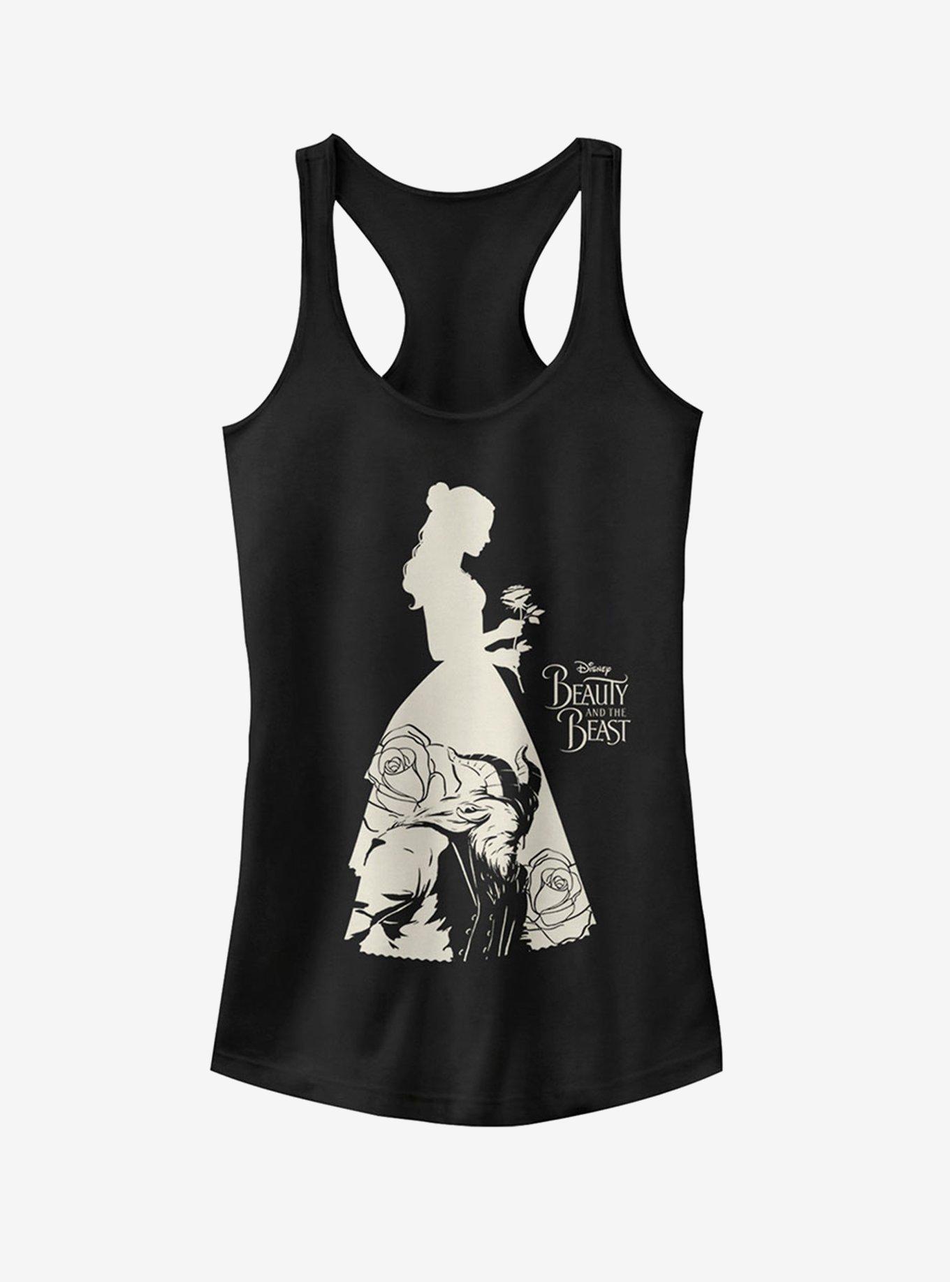 Only a tale as old as time can tell the story of the beautiful Disney Beauty and the Beast Dress Silhouette Juniors' Racerback Tank Top! A profile of Belle is shaped by a rose and the Beast in white print down this fitted tank top.