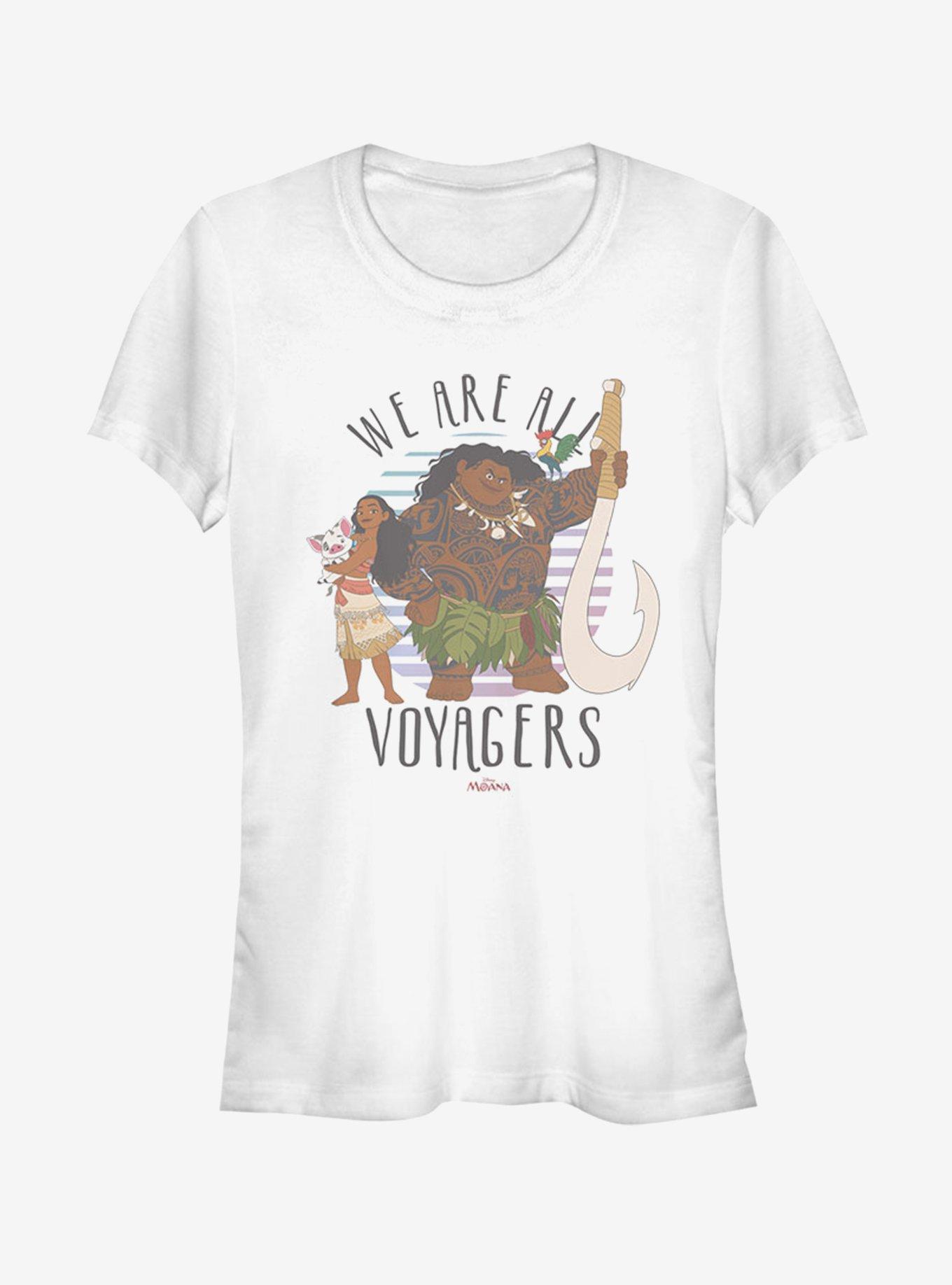 We were voyagers! Why'd we stop? Discover your inner voyager with the help of this fitted white tee from Disney's Moana . It features Moana holding Pua and Heihei perched on Maui, surrounded by "We are all voyagers" verbiage.
