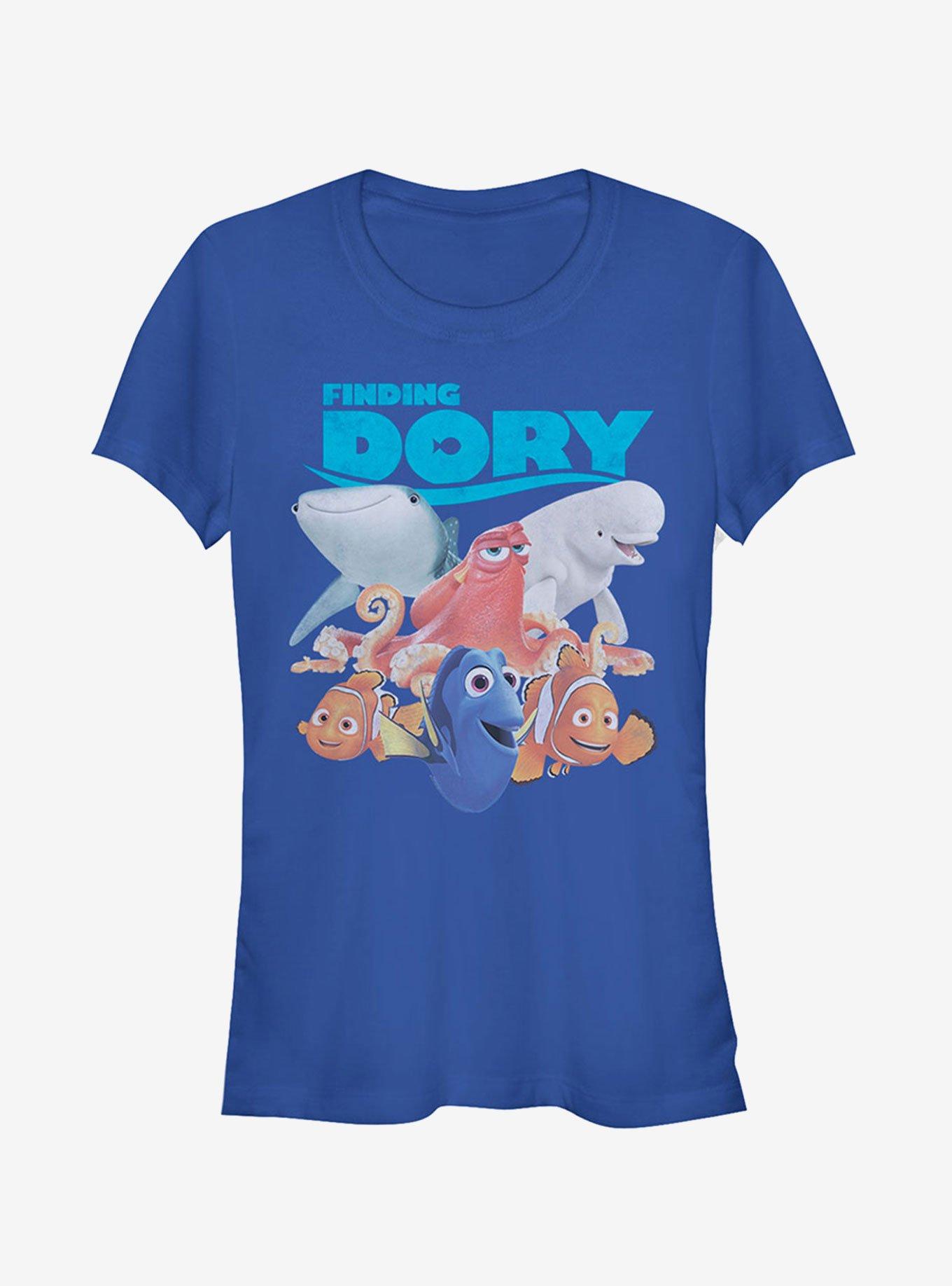 Meet Dory's friends dressed in your best with the Finding Dory Whole Gang Juniors' T-Shirt! The whole gang is pictured on this cool fitted Finding Dory shirt with Dory, Bailey, Nemo, Marlin, Hank, and Destiny printed across the front.