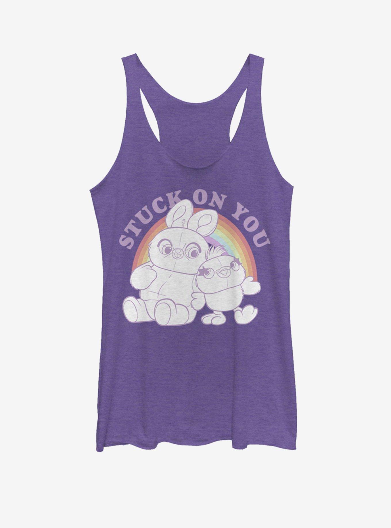 Bunny and Ducky are stuck on each other. Wear this top and they'll be stuck on you, too! This purple heathered tank features the carnival pals from Toy Story 4 in front of a rainbow.