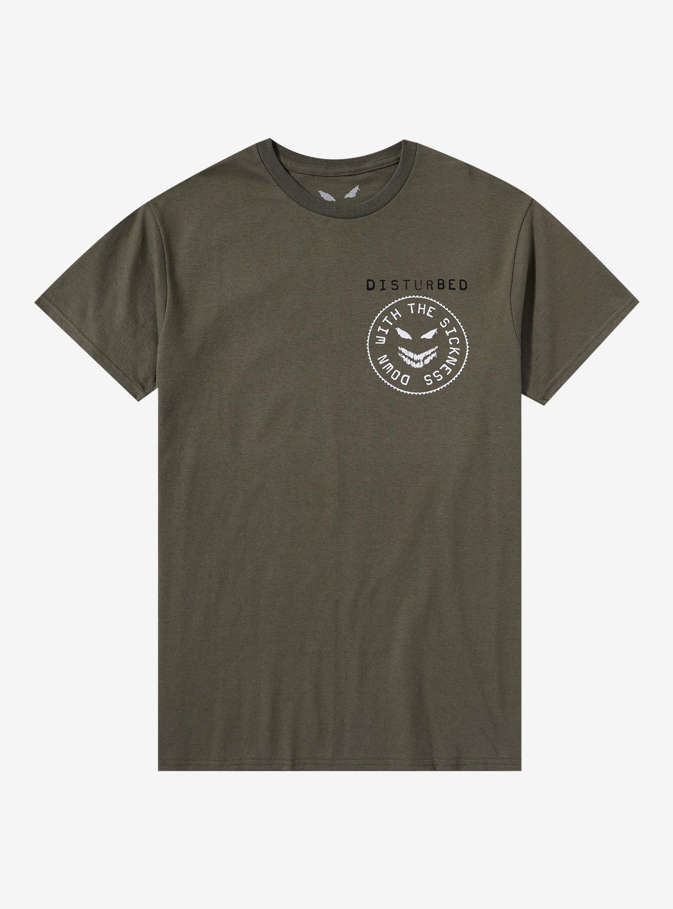 Time to get down with the sickness in a new Disturbed tee! This army green style is two sided, with the chorus line on the front in a circle logo with the band's demon mascot's face in the middle. The back has a graphic inspired by The Sickness (2000) cover art. Please note: Style runs large; size down for a tighter fit.