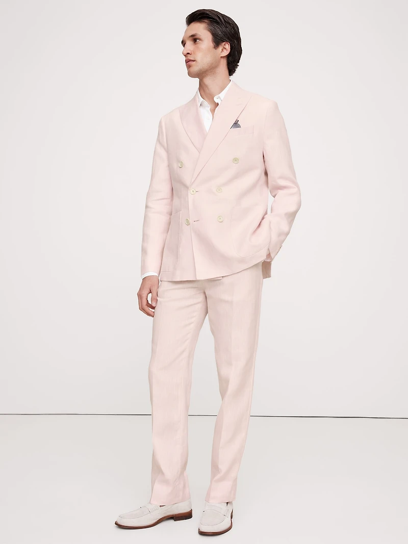 Designed with warm climates in mind, this double-breasted suit jacket is cut from premium linen—seen here in a soft délavé pink. Tailored Slim Fit: Slim through the chest and waist, with an Italian-style soft shoulder. Slim sleeves. Peak lapel with 4-button front. Three exterior pockets, three interior pockets. Double back vent. Fully lined.