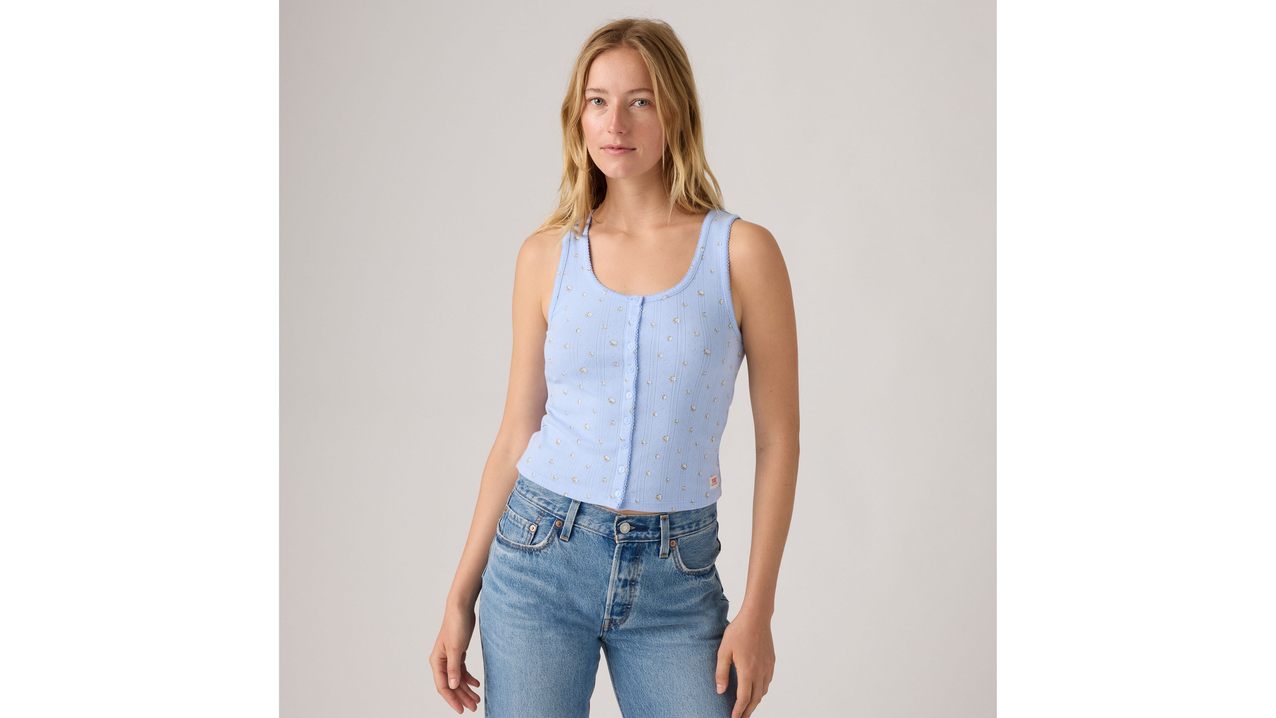 Meet the Dry Goods Pointelle Tank: stamped with our signature Dry Goods label and featuring buttons and a fitted silhouette, it won't be long before you're pairing this top with all of your denim.