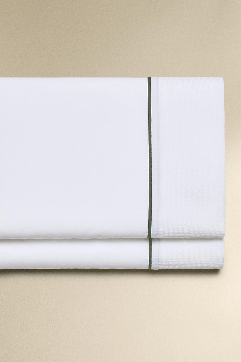 Flat sheet made of 300-thread-count cotton percale with a piqué design and piping detail.
