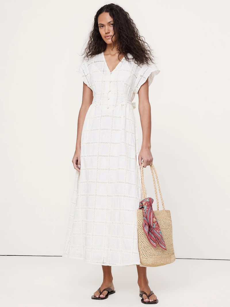 We obsessed over the details for this warm-weather ready maxi dress. Intricately embroidered patchwork covers this soft cotton maxi dress—lightweight, breezy, and made for going places. Fit & Flare: Fitted bust and waist with a flare skirt. V-neck with button placket. Tie waist Slip lining.