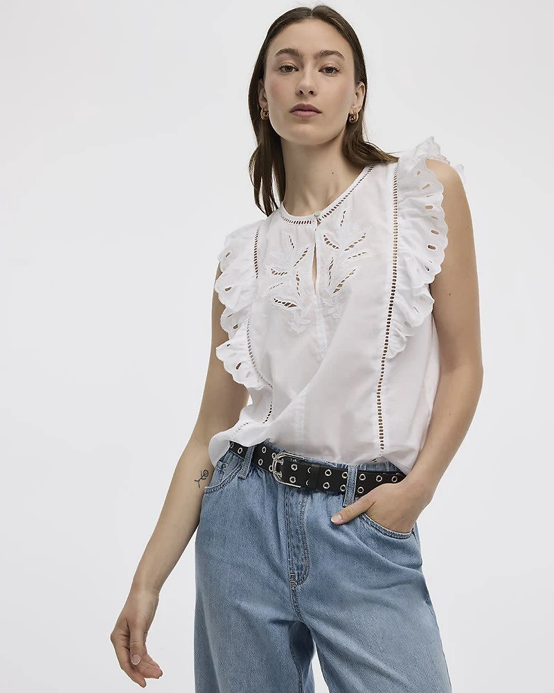 Add some style to your seasonal wardrobe with this super cute blouse featuring a crew neckline, ruffled sleeves and feminine embroidered details.