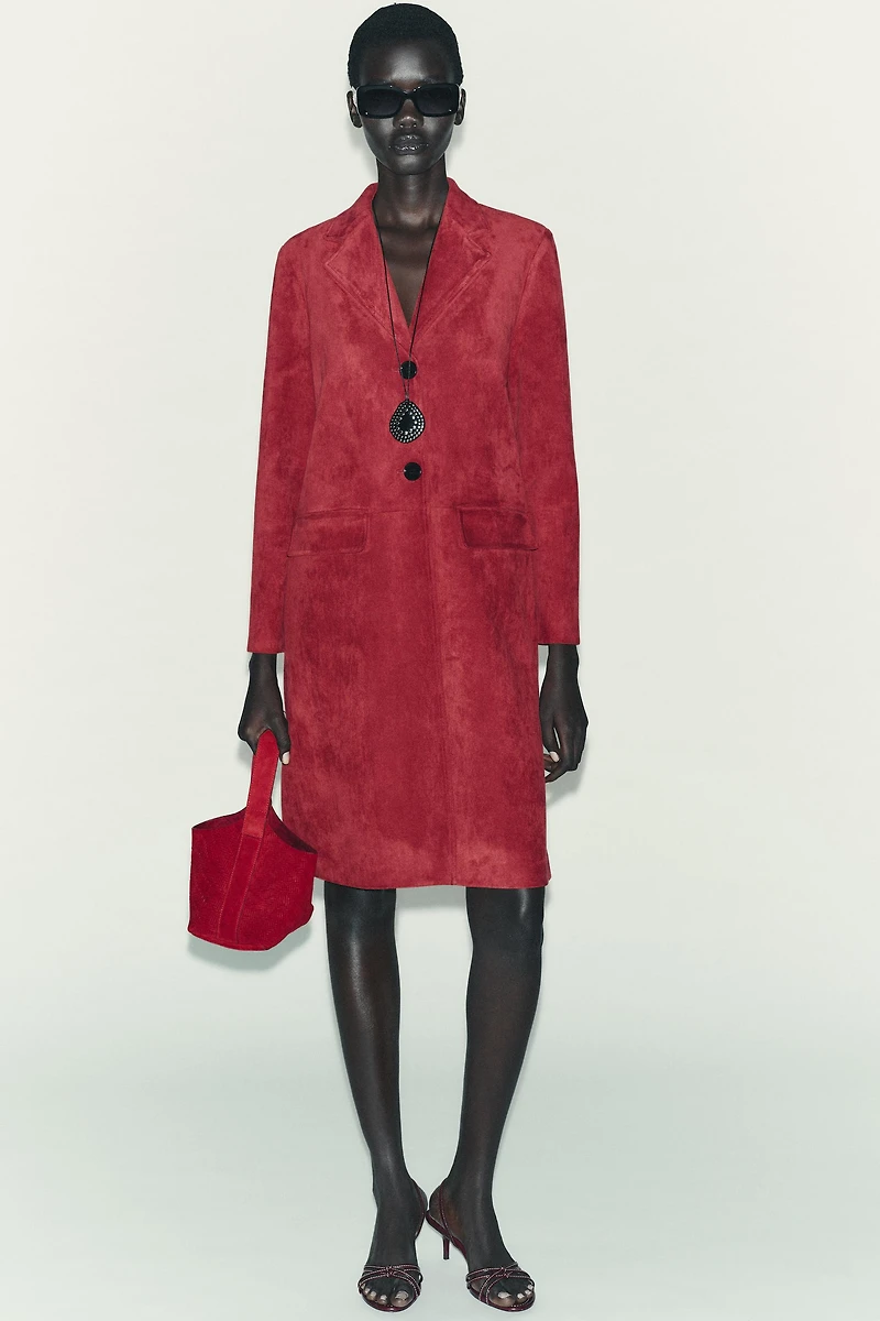 Tailcoat-style coat made in faux suede fabric. Notched lapel collar and long sleeves. Front flap pockets. Straight hem. Front button closure.