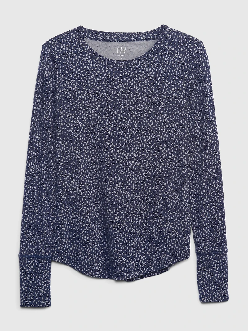 Soft cotton-modal knit. Long sleeves. Crewneck. Certain styles have allover prints.