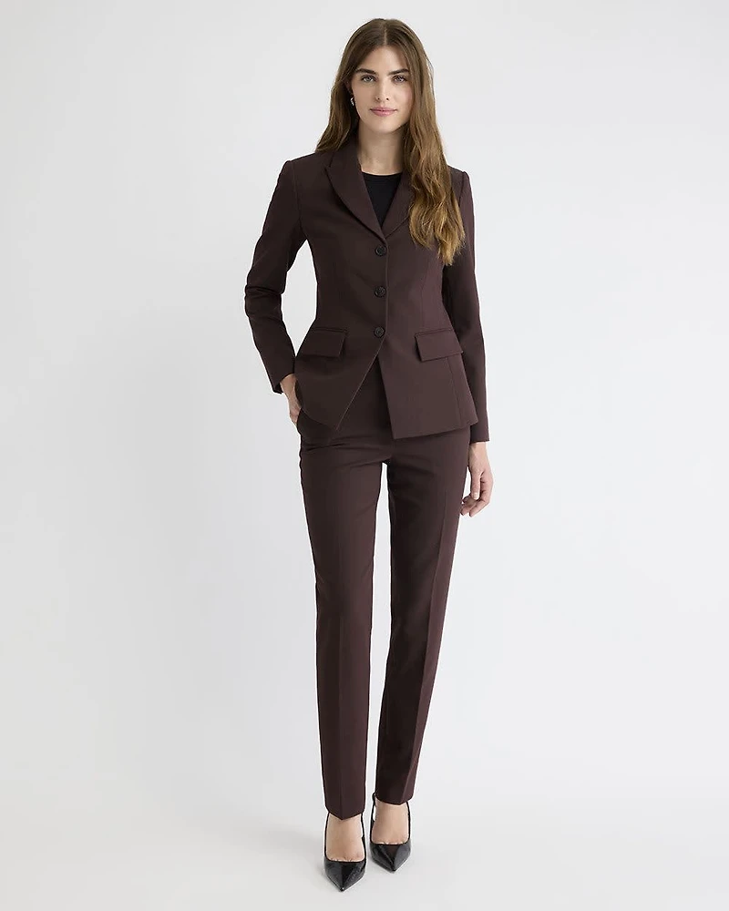 This elegant fitted blazer, offered in a rich fig hue and designed with a three-button closure, is the definition of sophistication. The perfect blazer for busy days at the office. Matching pants available. Fit & Cut - Fitted: Designed to fit close to the body - Long sleeves - 26.25'' back body length (size 8) Design Details - Stretch woven fabric : contains 61% recycled polyester* - Stretch lining - Tailored collar - Three-button closure - Decorative buttons on cuffs - Flap pockets at waist * This garment contains recycled polyester made out of a mix of bottles and fabric waste.