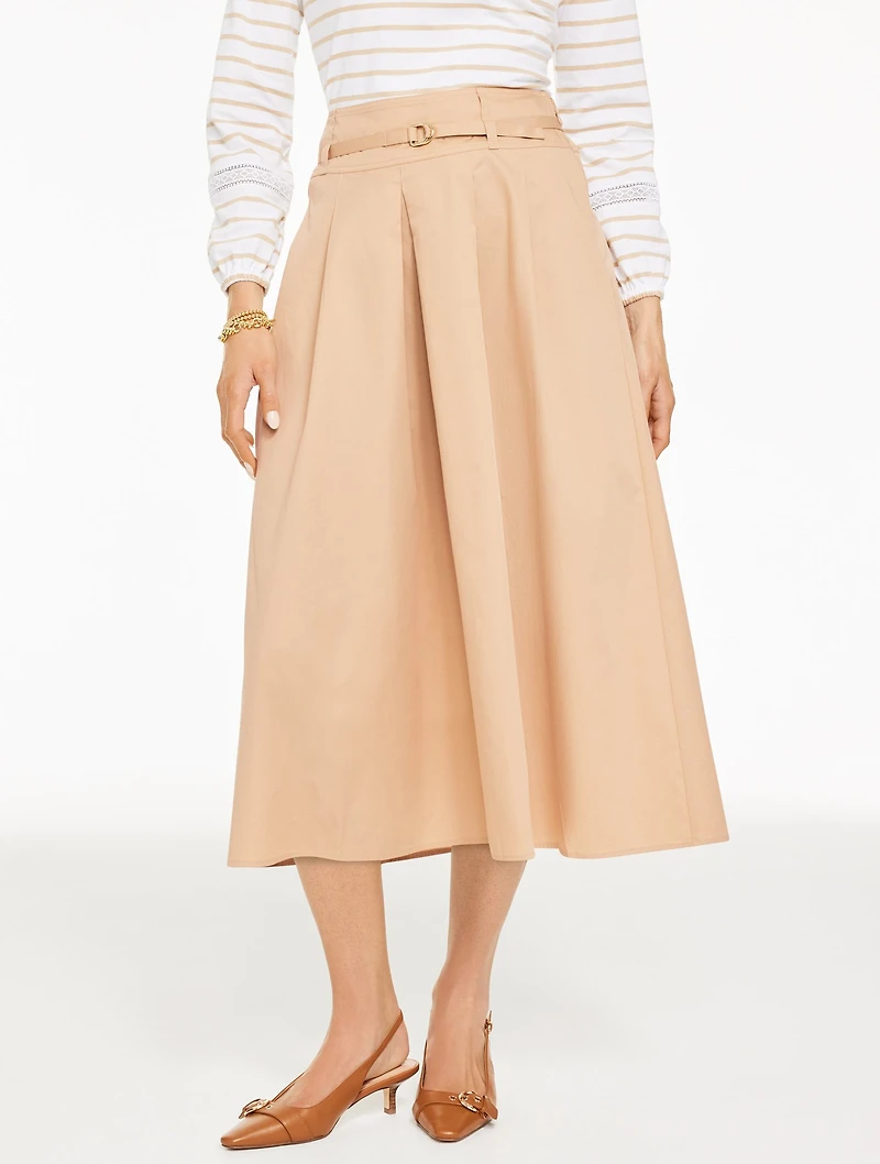 Flowy, fabulous. Our always-flattering fit & flare midi skirt is crafted from cotton twill for a polished look. Features a removable belt. Ready to elevate your favorite work and weekend ensembles.