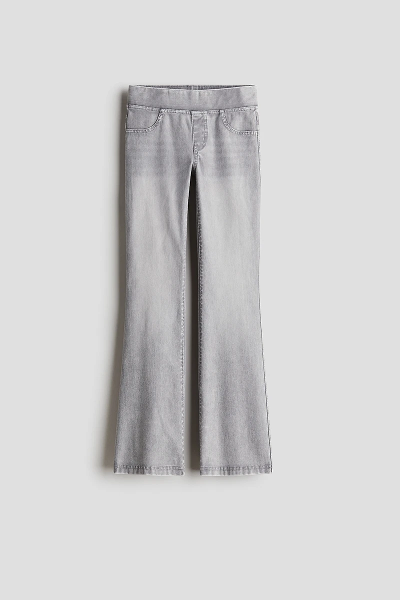 Skinny-fit pants in denim-look jersey. Covered elastic at waistband, mock fly, and flared hems. Mock front pockets and regular back pockets.