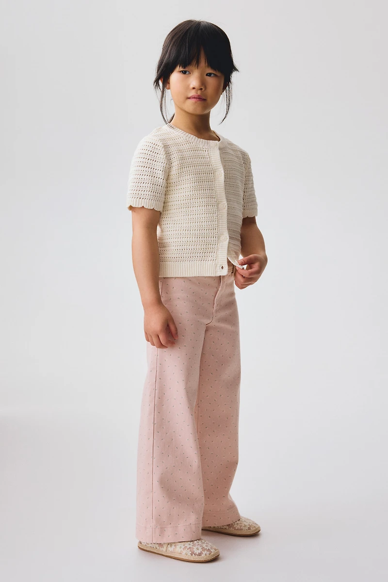 Pants in stretch cotton twill. Adjustable, elasticized waistband, zip fly with button, and open back pockets. Wide, flared legs.