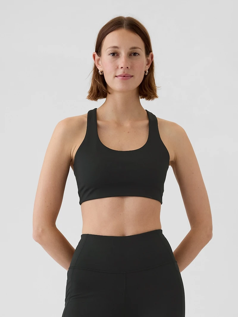 Soft, stretch sports bra. Moisture-wicking helps keep your skin dry. Stretch allows freedom of movement while providing superior shape retention. Scoop neck. Racerback straps. Designed for medium impact workouts from training to jogging and cycling. This sports bra is made with 79% recycled polyester. Compared to virgin materials, using recycled materials helps to reduce resource use and waste. This product was made in a factory that invests in gender equality and women’s empowerment. Through RISE (Reimagining Industry to Support Equality) and Gap Inc. ’s program P. A. C. E. (Personal Advancement & Career Enhancement), we support people who make our clothes to build the skills, knowledge, confidence, and resilience needed to advance in work and life. .Learn more.here.