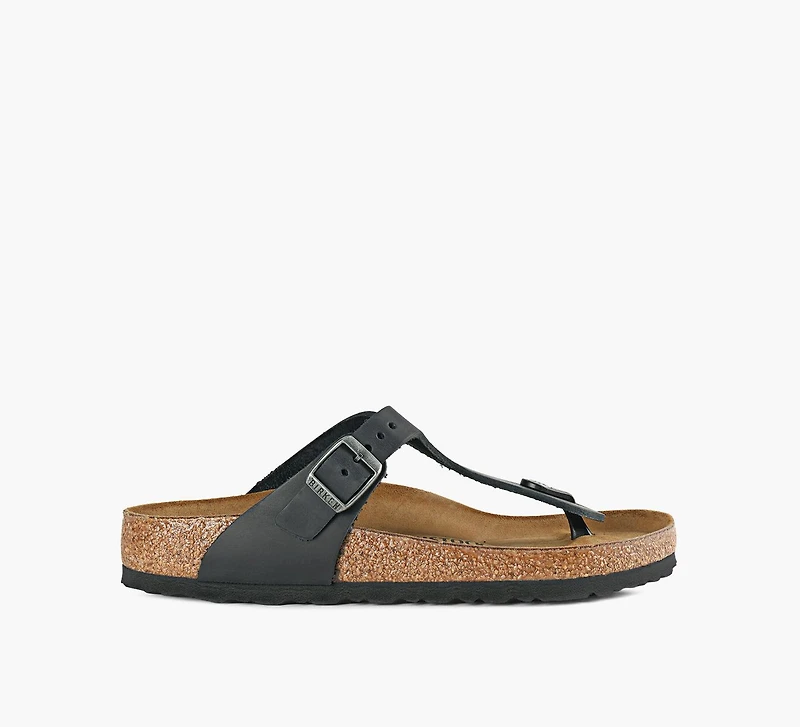 The Birkenstock Gizeh blends classic design with signature comfort. Featuring a sleek thong silhouette, this sandal is crafted from durable oiled nubuck leather with a lived-in finish. The contoured cork-latex footbed promotes natural movement, while the EVA outsole provides lightweight cushioning. Adjustable straps ensure a secure fit, making it a versatile essential for everyday wear.