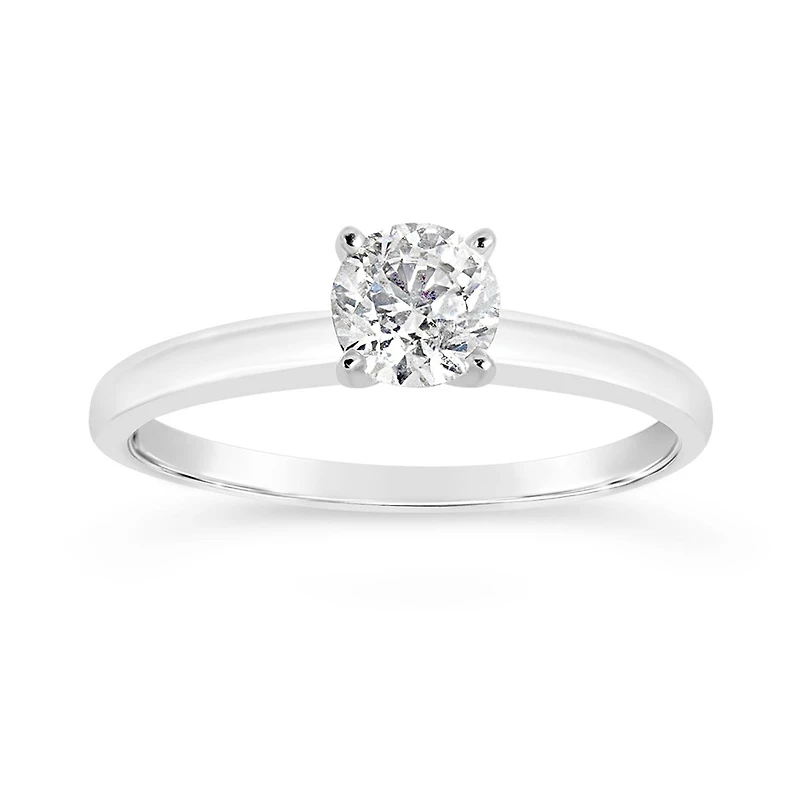 The most iconic of engagement ring styles, the solitaire symbolizes the connection and unity you share with the one you promise to love for an eternity. Featuring a round .50ct ideal cut Glacier Fire Canadian Diamond set into a 14k white gold band, this ring shines bright, like your love.