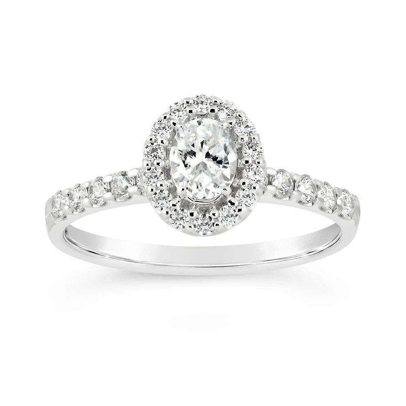 Like your love, this .60ctw Glacier Fire Canadian diamond bridal ring shines for eternity. Beautifully crafted in smooth 14k white gold, this stunning engagement ring features a one-of-a-kind oval cut Canadian diamond. Glittering with a round diamond halo and additional diamonds along the band, this timeless beauty will be adored for a lifetime.