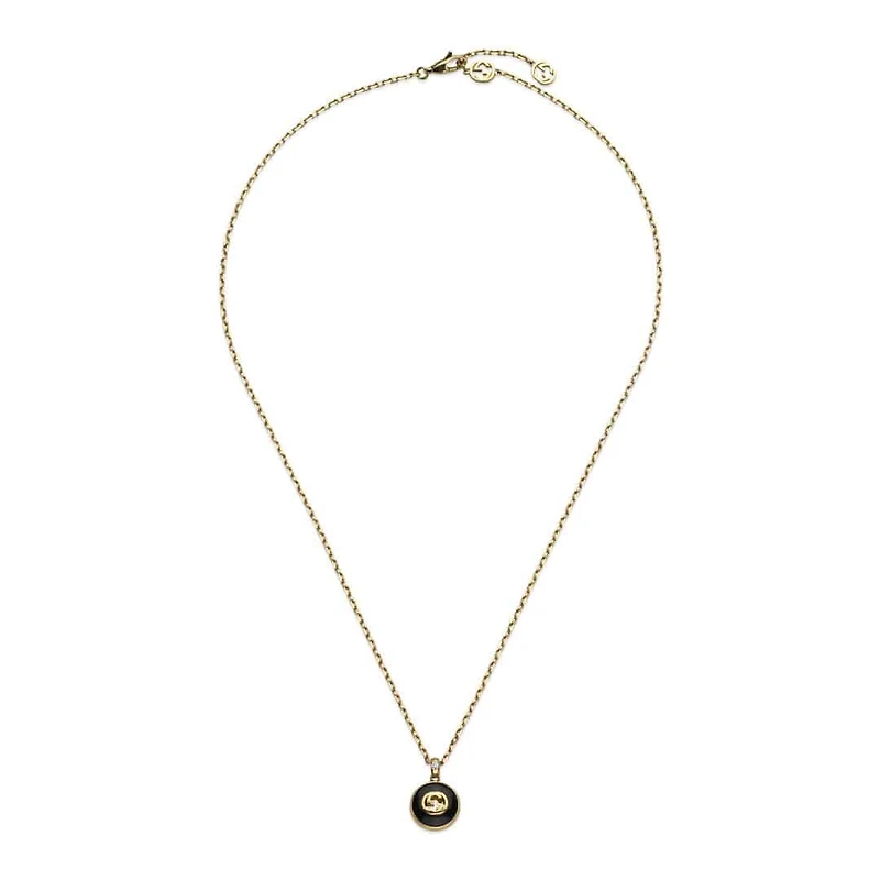 Necklace in yellow gold, onyx and diamond_42â''45 cm, pendant 12 mm