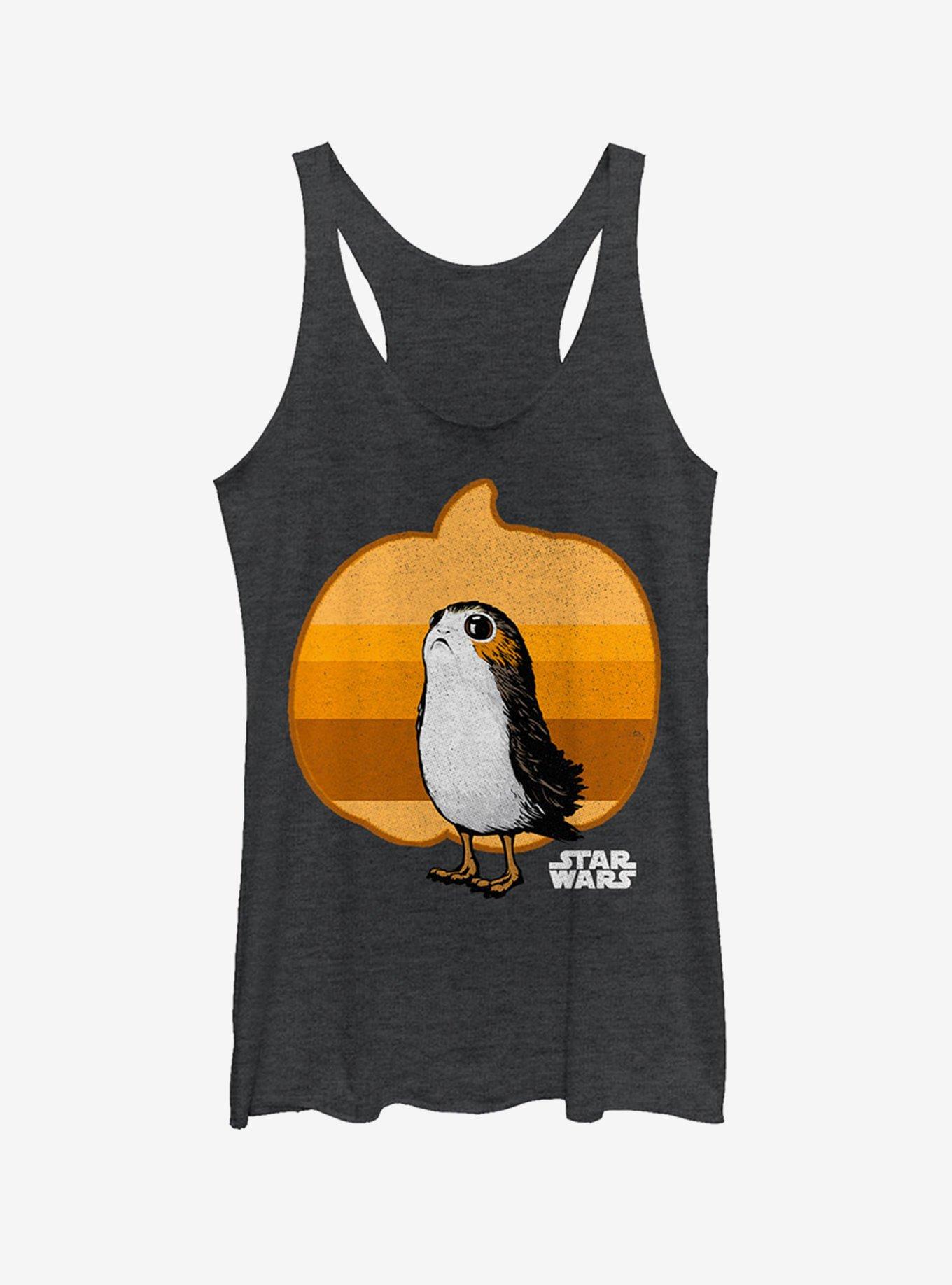 Forget about being the scariest person around this Halloween because you're going to be the cutest instead with the Star Wars Halloween Porg Pumpkin Women's Racerback Tank Top. This adorable Halloween tank top shows off a wide-eyed Porg in front of a striped pumpkin.