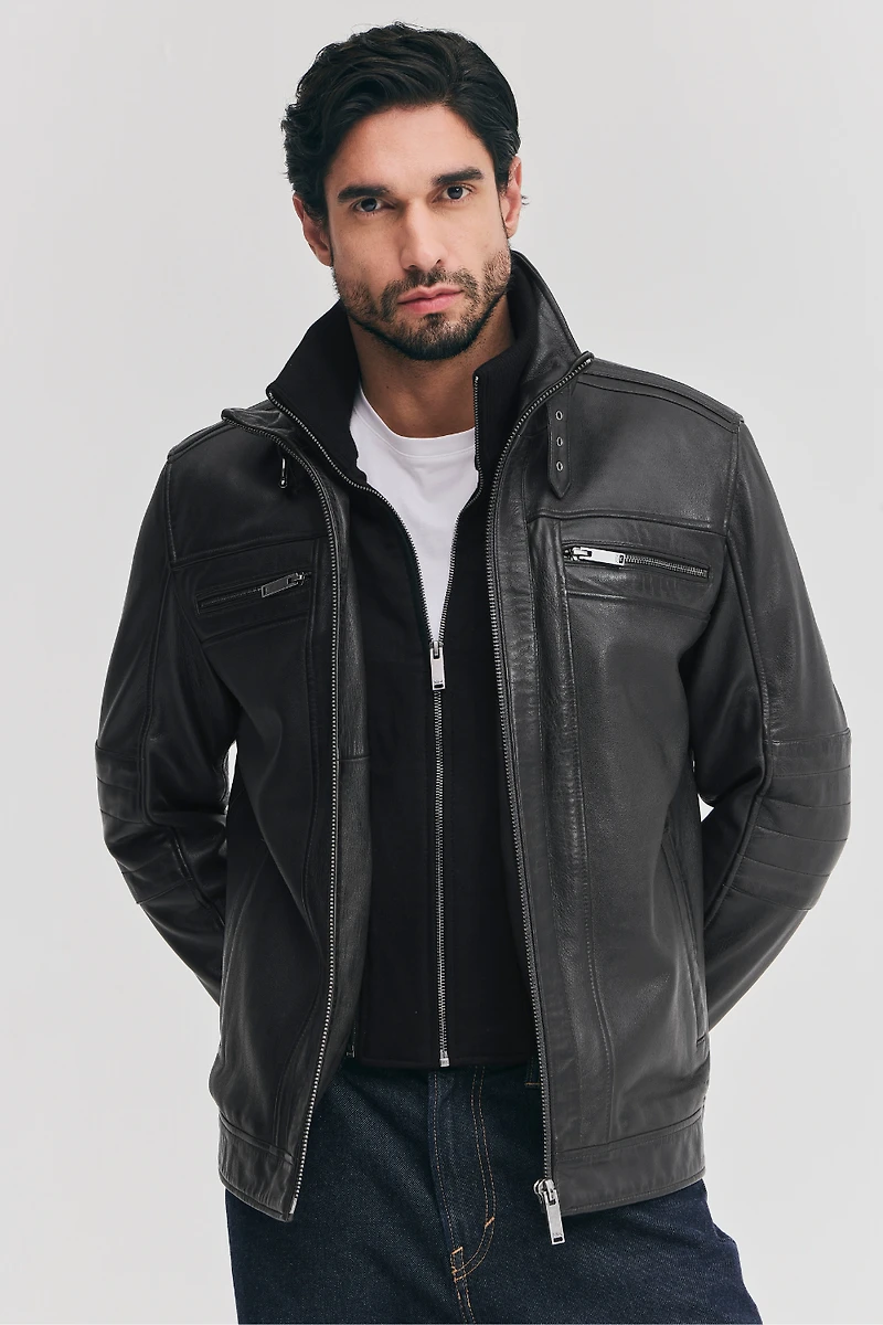 jacket returns, once again. Crafted in our premium lamb leather, the functional design of this style includes a zip-out knit bib that can be kept in or zipped out, as the weather dictates and a quilted liner, for added insulation on the coolest days. Additional features include zipped chest pockets, quilted elbow panels, front welt pockets and buckled collar closure. Handsome, versatile and styled for transitional Canadian seasons, HAYDEN will elevate your casual look to new standards.
