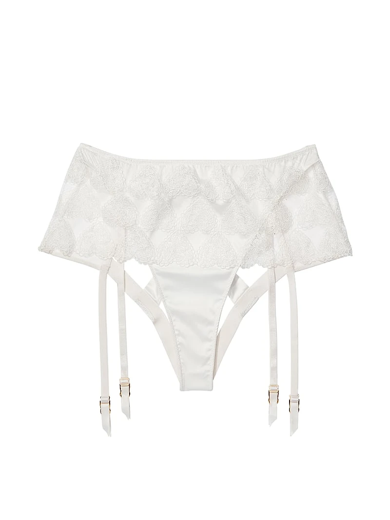 A high-waisted, peekaboo style features garter straps that invite your sultriest thigh-highs. Wrapped with embroidered hearts around the hips and finished with a bow in back.